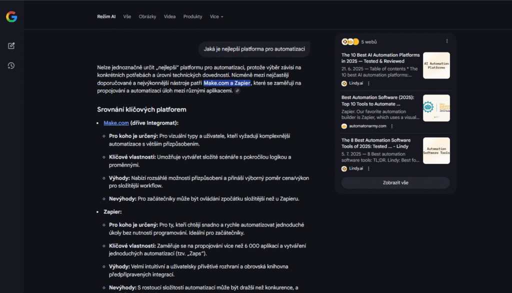 Kontextová doporučení: Umělá inteligence by mohla navrhovat konkrétní produkty nebo služby na základě kontextu konverzace. Zeptejte se na automatizaci marketingu a možná uvidíte zmínku o HubSpot spolu s technickými radami. Jak by to mohlo fungovat, můžeme vidět již nyní v Google, kde se přehledy umělé inteligence a placené reklamy zobrazují vedle sebe.