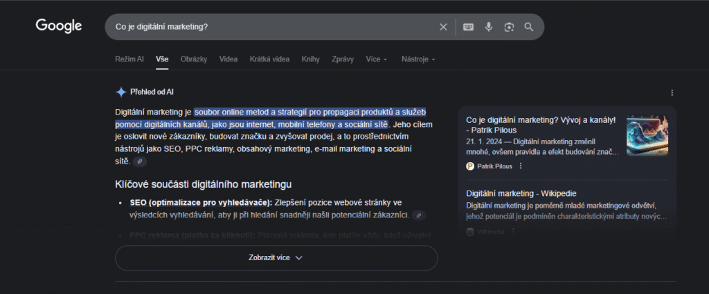 Pro tyto typy vyhledávání nyní Google zobrazuje AI odpověď nad klasickými výsledky, čímž zásadně snižuje počet prokliků na jednotlivé weby.