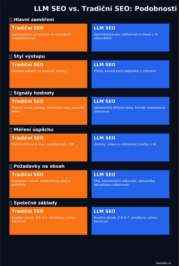 Tradiční SEO se zaměřuje na umístění ve výsledcích vyhledávačů. LLM SEO se zaměřuje na to, aby bylo citováno v odpovědích generovaných umělou inteligencí. Oba se spoléhají na kvalitní obsah, autoritu a strukturu, ale měřítko úspěchu je odlišné.