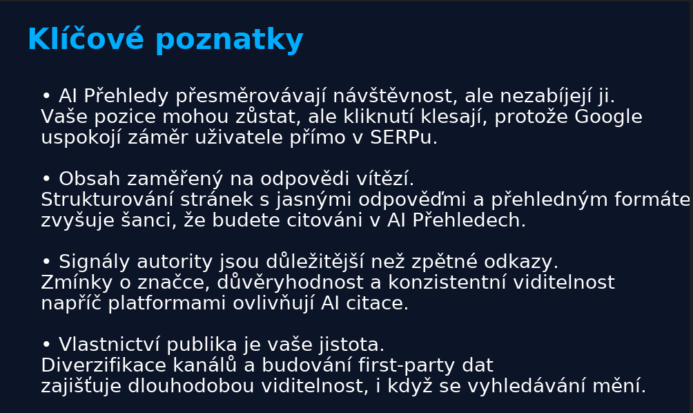 Pro firmy je riziko zřejmé. Pokud váš obsah není strukturován pro LLM, vaše odborné znalosti se možná nikdy nedostanou na povrch, i když máte dobré hodnocení v Google. To znamená ztrátu viditelnosti ve prospěch konkurence, která optimalizuje pro obojí.