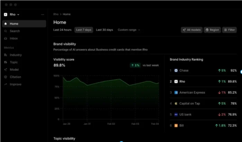 Specializované platformy, jako je Profound, jsou vytvořeny tak, aby sledovaly, jak často se značky a webové stránky objevují v odpovědích generovaných umělou inteligencí napříč platformami. Níže se podívejte na rozhraní Profound a jak pomáhá prezentovat viditelnost umělé inteligence..